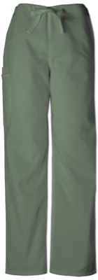 A casual Unisex pant features a natural rise and an adjustable webbed drawstring at the waist, one back pocket, and a cargo pocket with an inside cell phone pocket. Inseam 31".