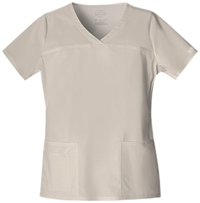 A V-neck top features crossover front yokes and patch pockets. The right side pocket has a sectional pocket and I.D. loop, and the left side has an instrument loop holder across the pocket. A back yoke, back princess seams and side vents complete the picture. Center back length: 27".