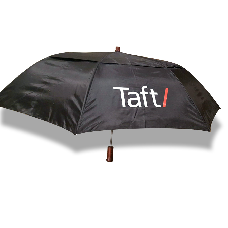 Automatic Open, Designed with a vented, windproof canopy construction. Features a metal shaft with wood handle and matching sleeve. Black nylon material, with TAFT logo.